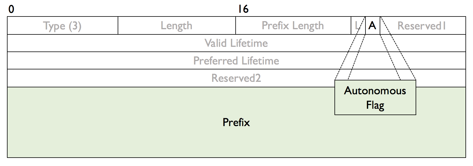 When the A (or autonomous address-configuration) flag is set to “1”, it specifies that the included prefix can be used for SLAAC. Thus, the Prefix Information Option message must include both a prefix and the A flag set to one for SLAAC to function properly.