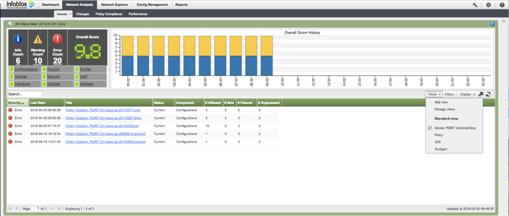 When you first log in to NetMRI, you get the issues screen with the general view. Under the Views drop-down menu, there is a ‘PSIRT Advisor Vulnerabilities’ view that is installed. When selected, only the PSIRT items are shown: