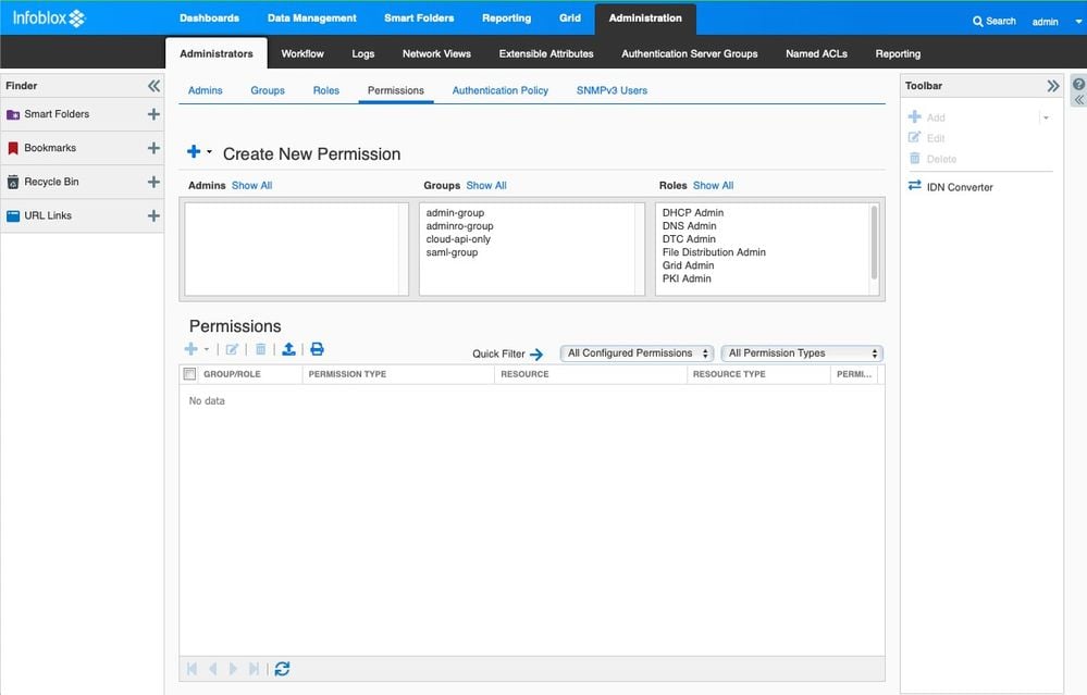 Providing access to administrators based upon their administrative and operational needs is important to allow delegation/distribution of administrative duties. By use of permissions based upon roles, least-privilege access can be easily achieved. Use of the RESTful web API (WAPI) allows you to remove the need for GUI access when localized specific access is required.